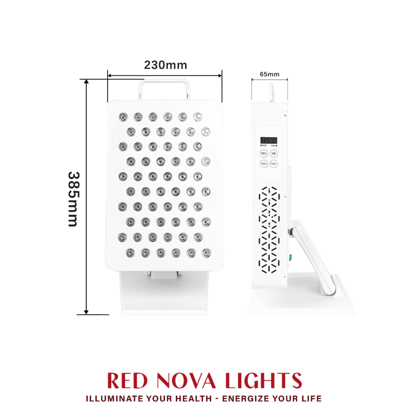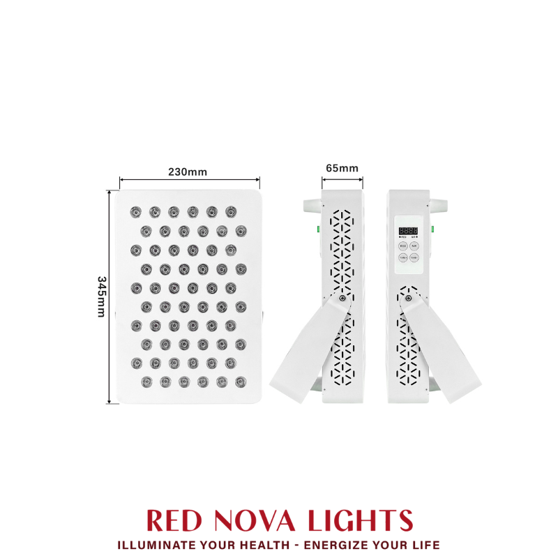 The Red Nova Light Solo Mini 300 is a portable, high-performance red and near-infrared LED panel, designed for those seeking convenience and effective light coverage in a compact form. Featuring 300W of LED power and 60 high-output LEDs, this panel utilizes five optimized wavelengths: 630nm, 660nm (red light) and 810nm, 830nm, 850nm (near-infrared light).